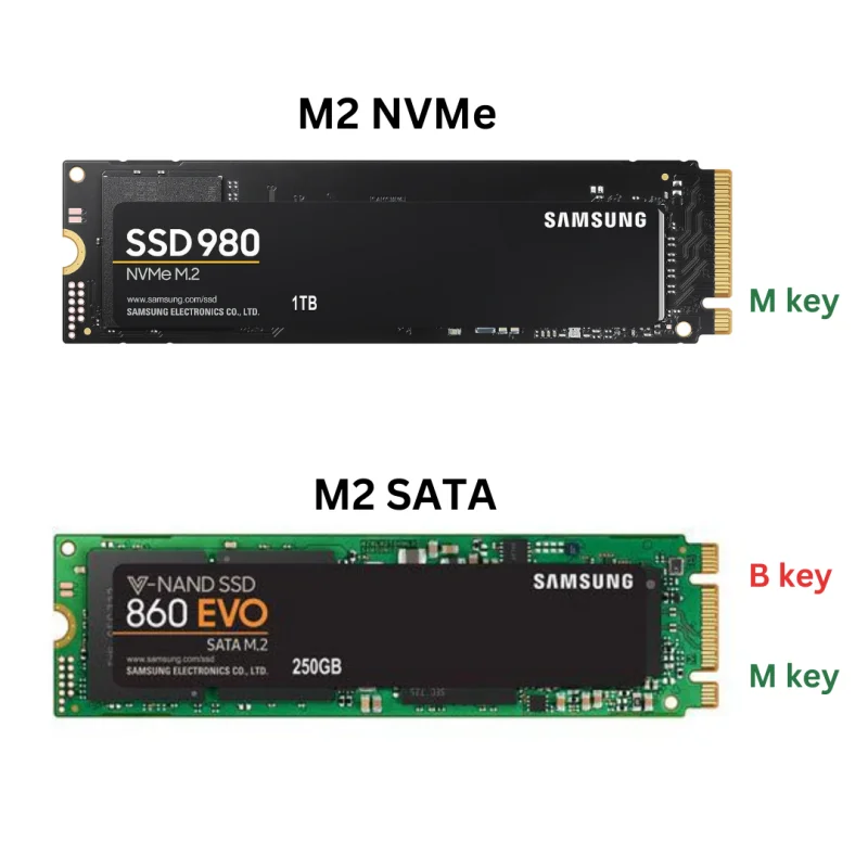 M.2 NVMe: Lebih besar dan dapat memiliki panjang 80mm atau 60mm. Memiliki label kunci M (M Key)