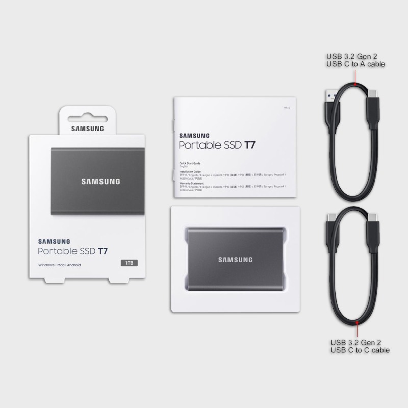 Access your files anytime, anywhere. The T7 is compatible with PC, Mac, Android devices, gaming consoles, and more. Included in the box are USB Type C-to-C and Type C-to-A cables for added convenience.